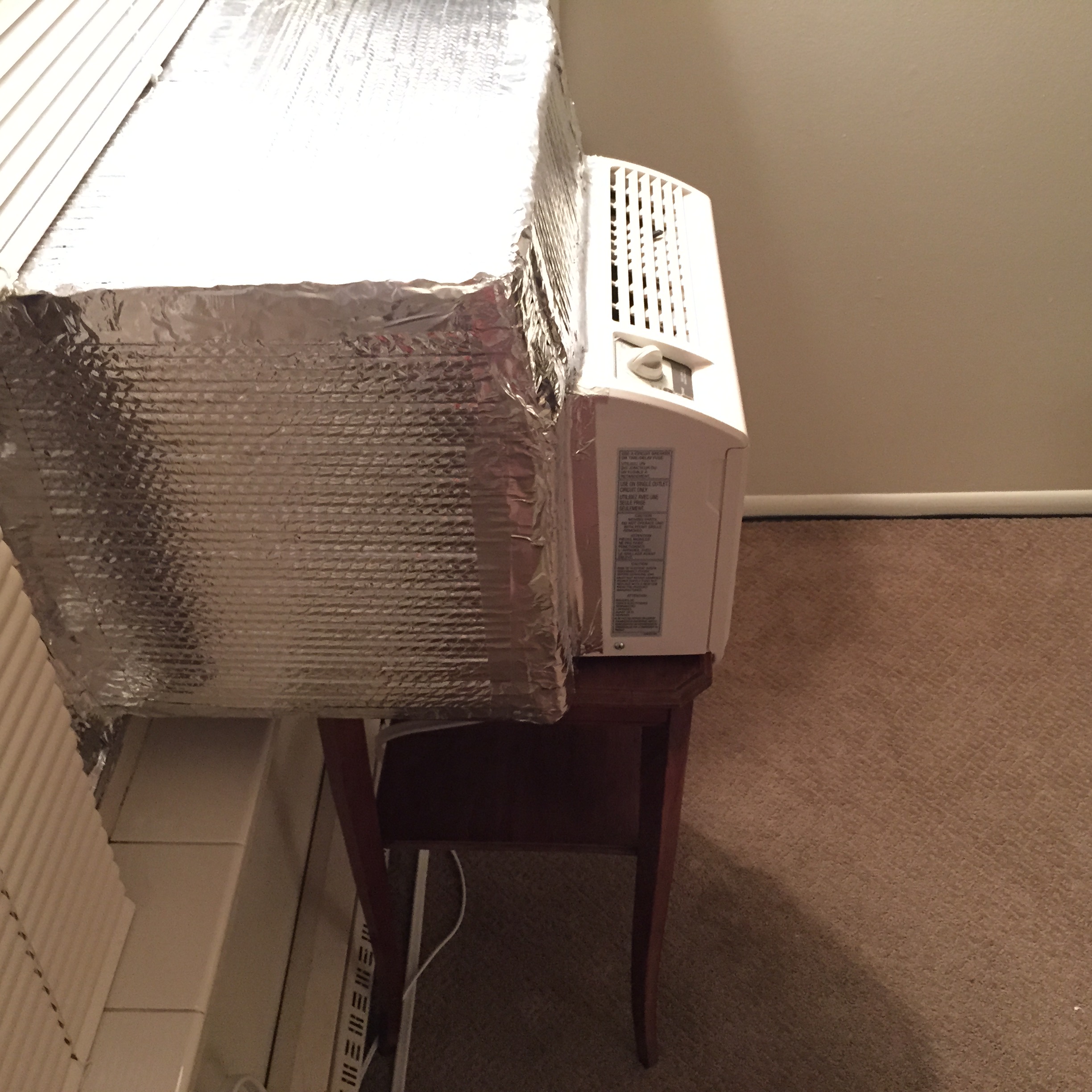 It was working fine, and then we went on a cruise to Alaska and came back to a 100 degree apartment. The duck tape was all melty soft and our little putt puttin window conditioner wasn’t cooling down a fly. So my boyfriend went to work with cardboard and those car sunshield reflectors and this is what came out of it: